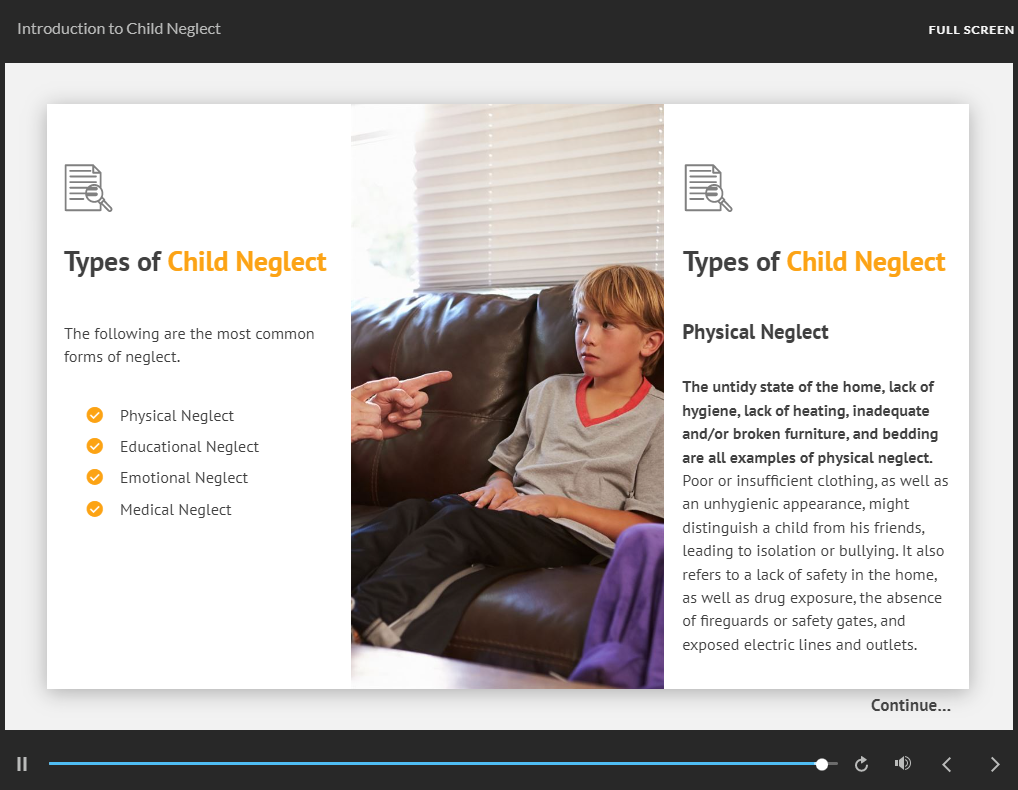 This online extensive Child Neglect Awareness Course is broken down into bite-sized modules so that you can learn at your own pace and in your own time. Furthermore, our experts are only an email or phone call away from answering any of your Child Neglect Awareness Course related questions.