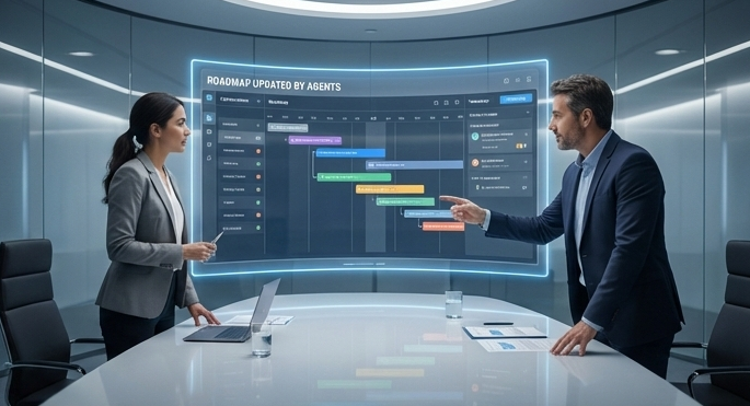 Two professionals analysing project timelines and performance metrics on a digital dashboard, illustrating collaborative decision-making, data analysis, and strategic planning in a modern business environment.